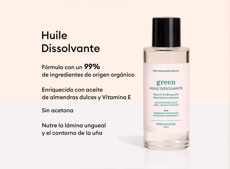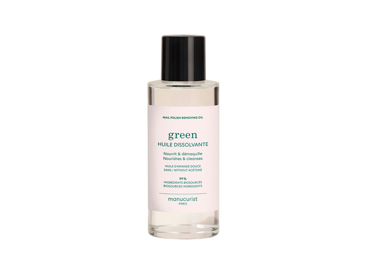 Manucurist Green Huile Dissolvante es un quitaesmalte en aceite que elimina eficazmente y con suavidad el pintauñas clásico Green™ a la vez que nutre la lámina ungueal. Su fórmula sin acetona y con un 99 % de ingredientes de origen orgánico, tiene un suave aroma a azahar y está enriquecida con aceite de almendras dulces para nutrir en profundidad.