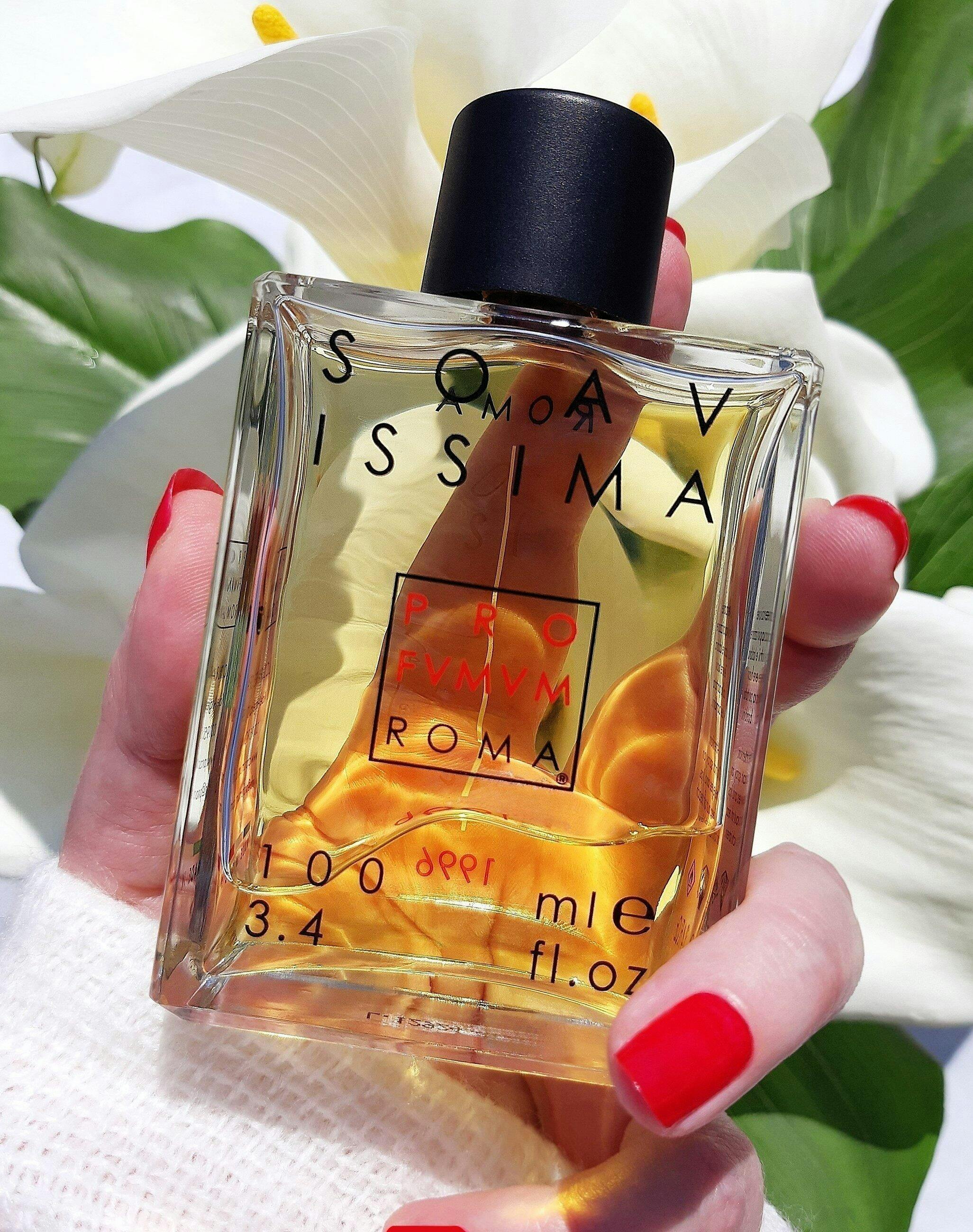 Profumum Roma Soavissima nos hace imaginarnos a una mujer sensual, que camina por una escalera, con un femenino vestido de seda negro en su piel diáfana. No se puede ver su rostro, pero solo la imagen en su mente: una visión elegante e imperdonable. Irresistible. Es la imagen de la feminidad, seda negra sobre piel diáfana. Lo divino rodeado de flores, aclamado al final del espectáculo.